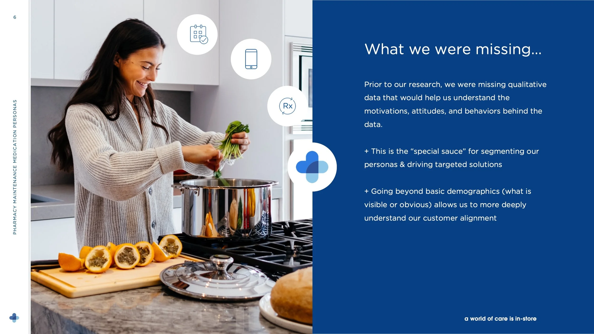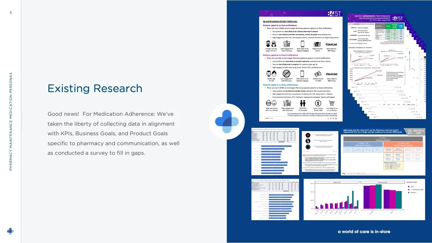 Our team decided to focus on Pharmacy first, as it is a primary driver for the Health & Wellness business. With that in mind, we drafted our research plan. This included relevant company objectives and key results (OKRs), related assumtions about our customers mindsets, behaviors, and how our technology was seen. We developed a set of hypotheses hand-in-hand with the product teams that would be utilizing these personas, as the personas will serve to help them make product decisions overtime. We also gathered as much existing research as possible as a part of the process to give us a full understanding of what gaps we currently have.