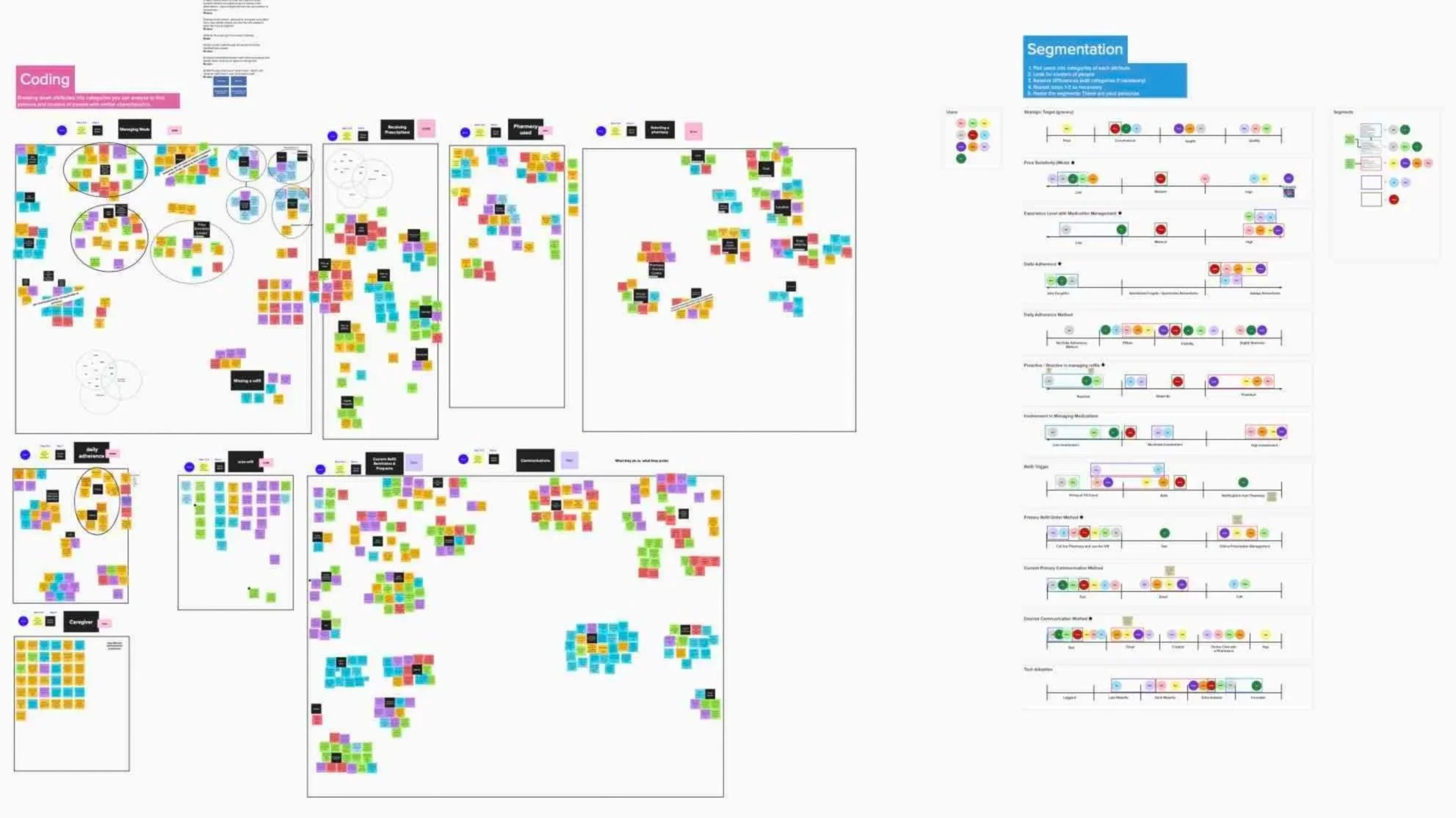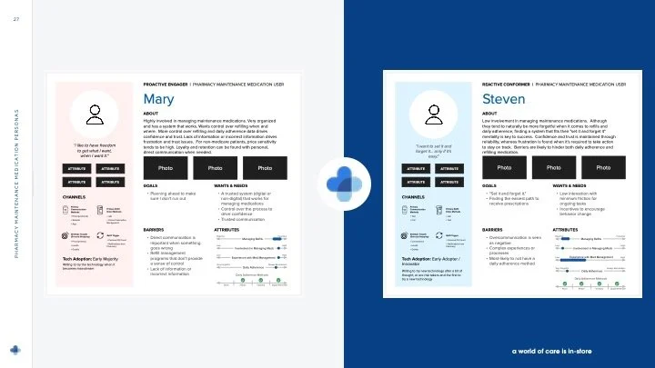 Then came the hard part. We scheduled, conducted, and evaluated a multitude of interviews across several primary variances. Although I can’t mention them in detail here for confidentiality purposes, in general: responsibilities, proactive vs. reactive approaches to medication management, differences in management methods, and frequency of those methods, are a few. We went through a rigorous process of coding each research insight from those initial variances to find patterns and clusters of people with similar characteristics. Lastly, we plotted users into categories of each defining attribute discover our final segmentation. Those were our personas.